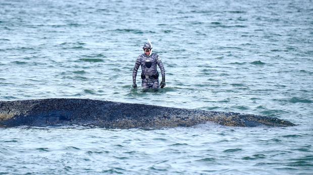 Robert Marc Lehmann geht auf Tuchfühlung mit einem gestrandeten Wal in der Ostsee. Foto: Daniel Bockwoldt