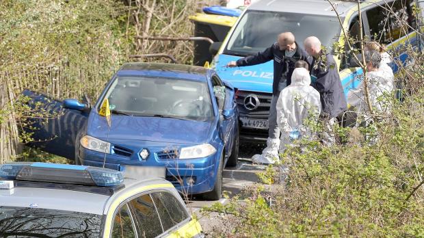 Am Ostersonntag waren zahlreiche Polizeikräfte in der engen Straße im Einsatz, in der das verfolgte Auto offensichtlich zum Stehen gekommen war. Kriminaltechnik und Spurensicherung seien vor Ort, hatte ein dpa-Fotograf berichtet. Der Bereich um die Sackgasse sei weiträumig abgesperrt und ein Sichtschutz aufgebaut worden. In der Straße stand ein blaues Auto, davor und dahinter jeweils ein Polizeifahrzeug. In der Windschutzscheibe des blauen Autos war ein Loch zu erkennen. Das Fenster auf der Fahrerseite war kaputt.